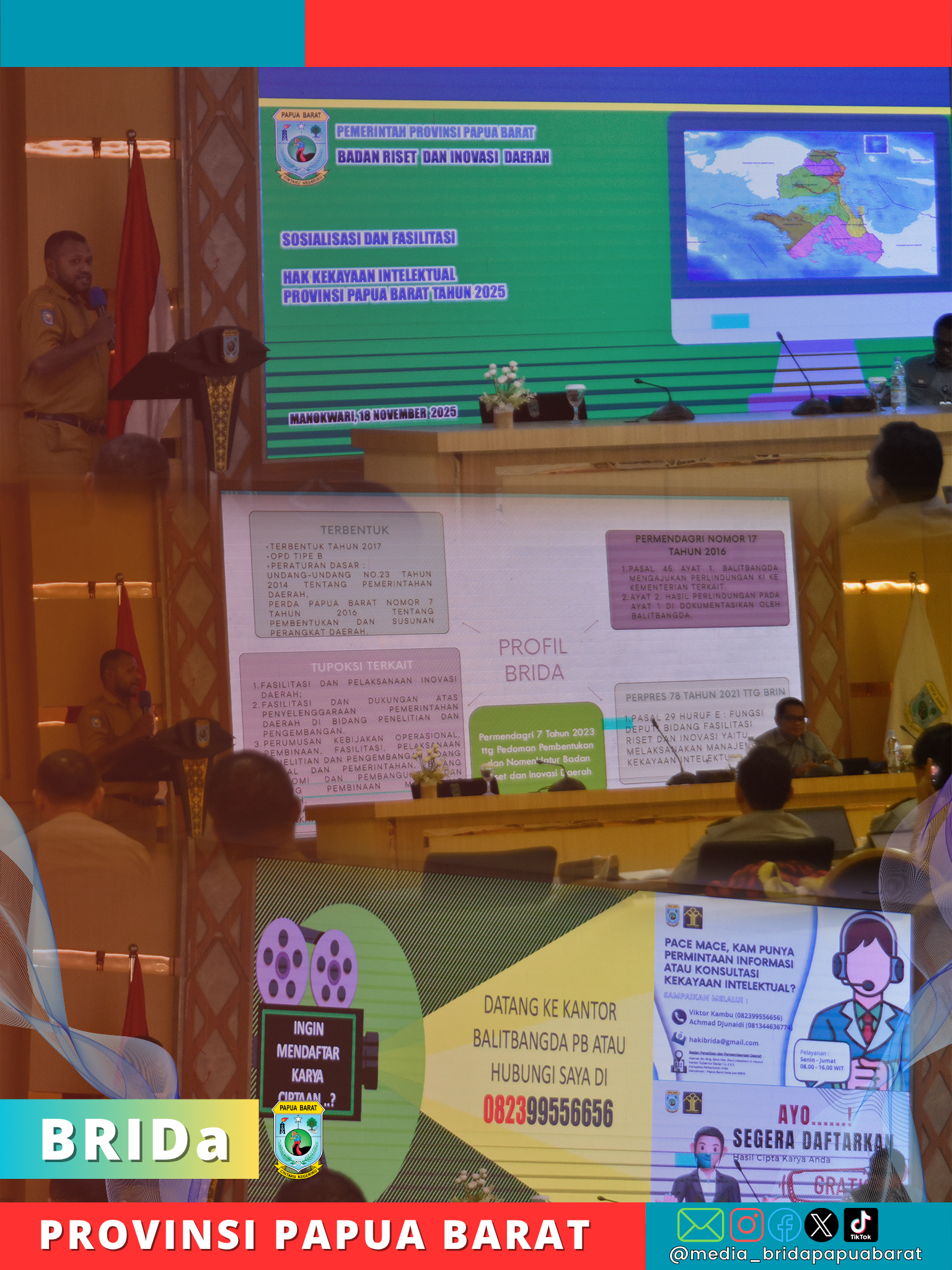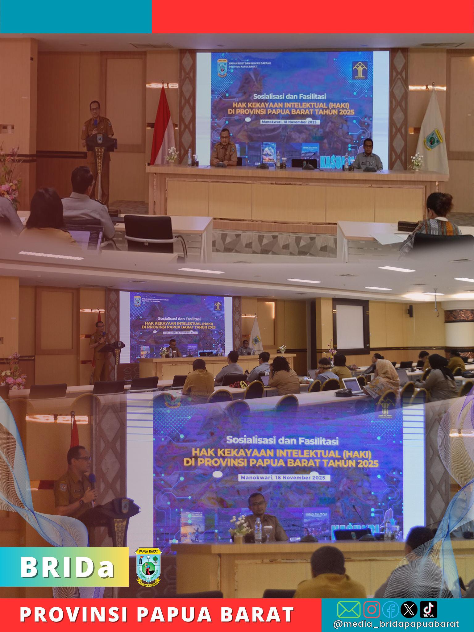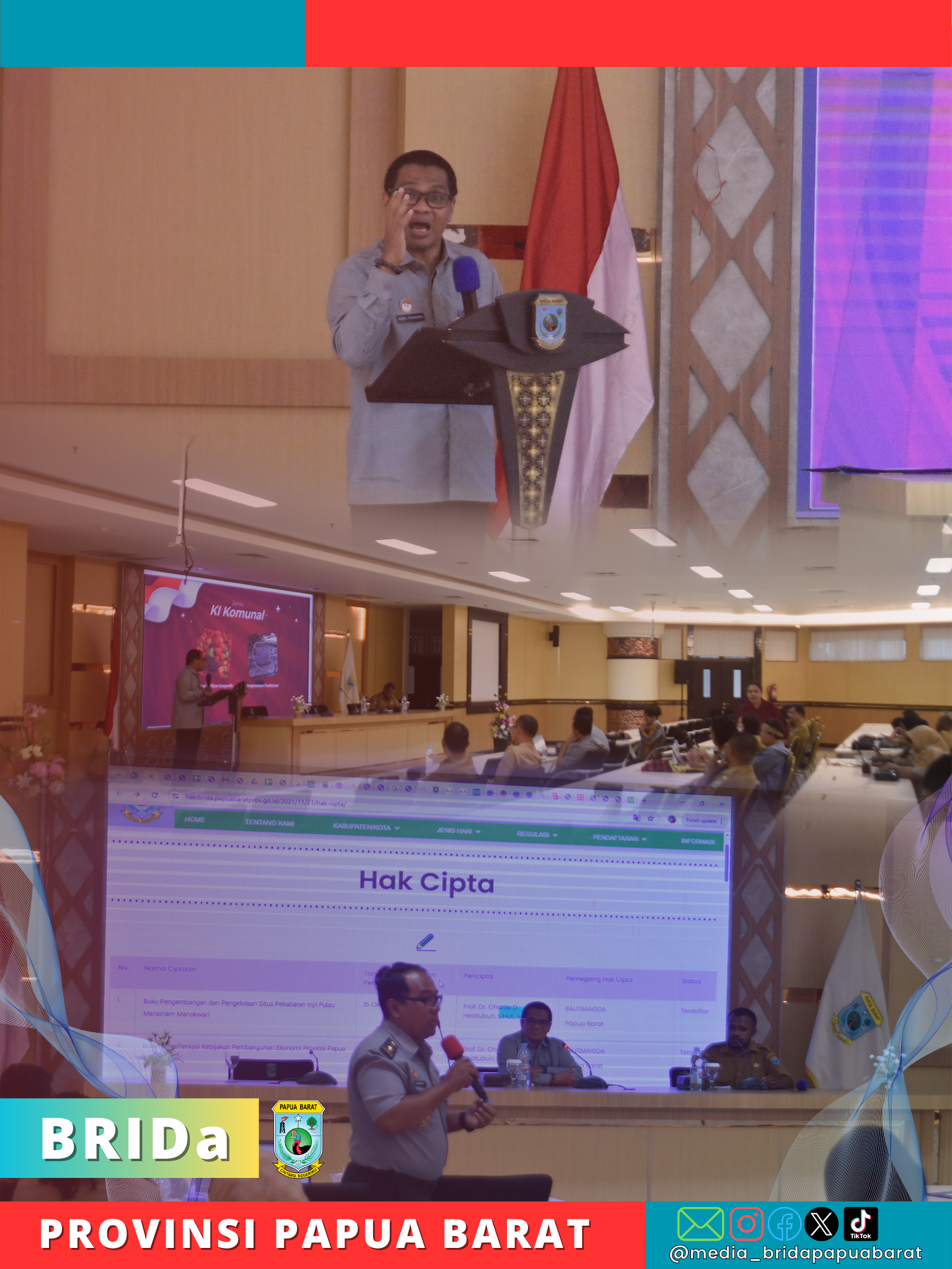 BridaNews_Manokwari – Pemerintah Provinsi Papua Barat melalui Badan Riset dan Inovasi Daerah (BRIDA) kembali menyelenggarakan Sosialisasi dan Fasilitasi Hak Kekayaan Intelektual (HAKI) sebagai bagian dari Proyek Perubahan SMART BRIDA: Akselerasi Ekosistem Riset dan Inovasi Papua Barat melalui Optimalisasi Implementasi Regulasi, Kemitraan Kolaborasi dan Digitalisasi, juga perlindungan dan pengelolaan kekayaan intelektual di daerah. Kegiatan ini berlangsung di Ruang Rapat Mokwan Lt. 3 Kantor Gubernur Papua Barat, Selasa (18/11/2025).